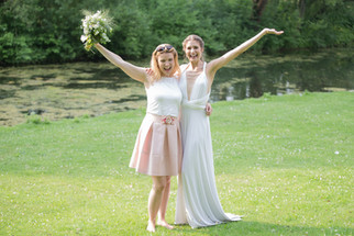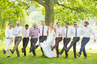 Zu Fuß geht's am Rhein entlang in die Auen. Abgesehen von der ganzen Entenkacke auf der Wiese ist es eine wunderschöne Idee, dort den Sektempfang zu veranstalten. Es werden Reden geschwungen, der Brautstrauß geworfen und wir nutzen die Gelegenheit, Gäste- und Brautpaarfotos zu erstellen. Es ist ein unbeschwertes, lockeres Beisammensein und alle haben eine Menge Spaß.