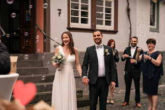 Das JA-Wort ist gefallen und die Gäste konnten Elena und Jonathan nun endlich zu ihrem Glück gratulieren. Sie wurden herzlich von Freunden und Verwandten vor dem Standesamt empfangen. Es gab Seifenblasen und das obligatorische "Herz ausschneiden" durfte natürlich auch nicht fehlen.
