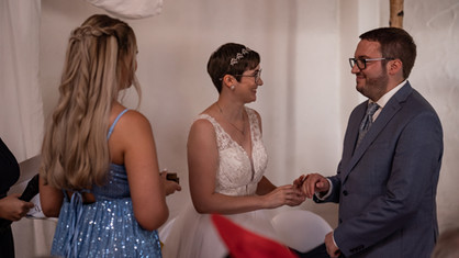 Die Freie Trauung fand in entspannter Atmosphäre mit musikalischer Begleitung in der Scheune statt. Anschließend wurden die Zwei draußen herzlich von den Gästen in Empfang genommen und natürlich mussten sie sich auch durch das beliebte Stoffherz schneiden, was den Beiden sehr viel Spaß gemacht hat.